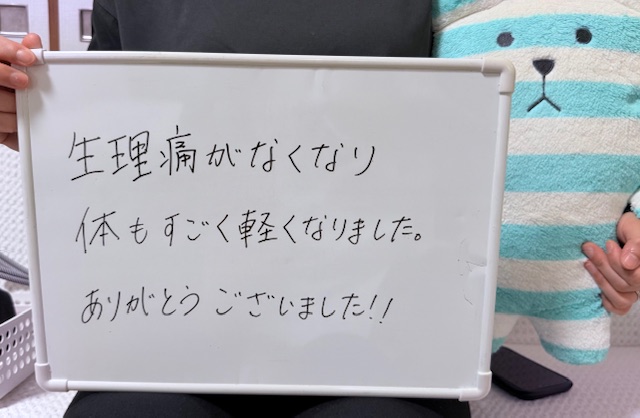 生理痛は2回目で良くなってますね。生理前も現在では問題ないようです。 生理は腰からの神経です。安定に入られています。