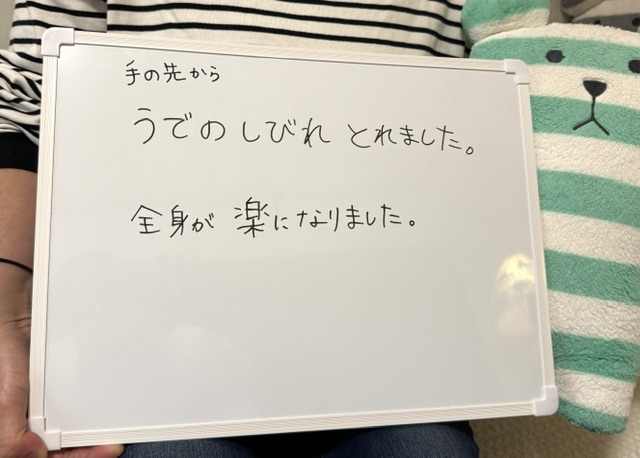 3度目来院する時には痺れがなくなってました。何だか全身楽になって、明日から、また、頑張ろうと思えます。